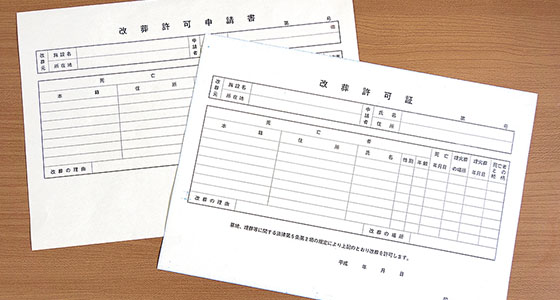寺院・民営霊園からの移転の場合は「収蔵(埋蔵)証明書」、公営霊園(墓地)からの移転の場合は「改葬許可申請書」を移転元の市町村役場に提出し「改葬許可証」を発行してもらいます。