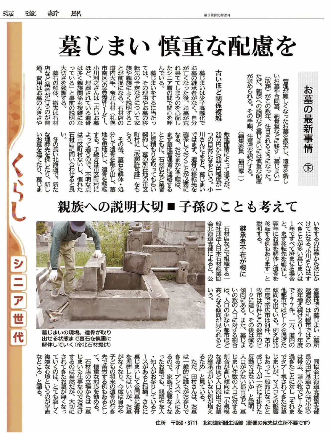 2018年5月28日 北海道新聞 21日の掲載に続き、お墓の最新事情(下)として、墓じまいについて取材いただき、墓じまいの現場での写真が掲載されました。
