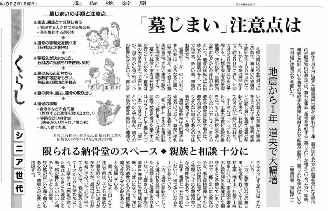 2019年9月2日 北海道新聞 昨年9月に起きた胆振東部地震から1年、倒壊したお墓を撤去、ご遺骨を移転する「墓じまい」が増えていることについて取材いただきました。