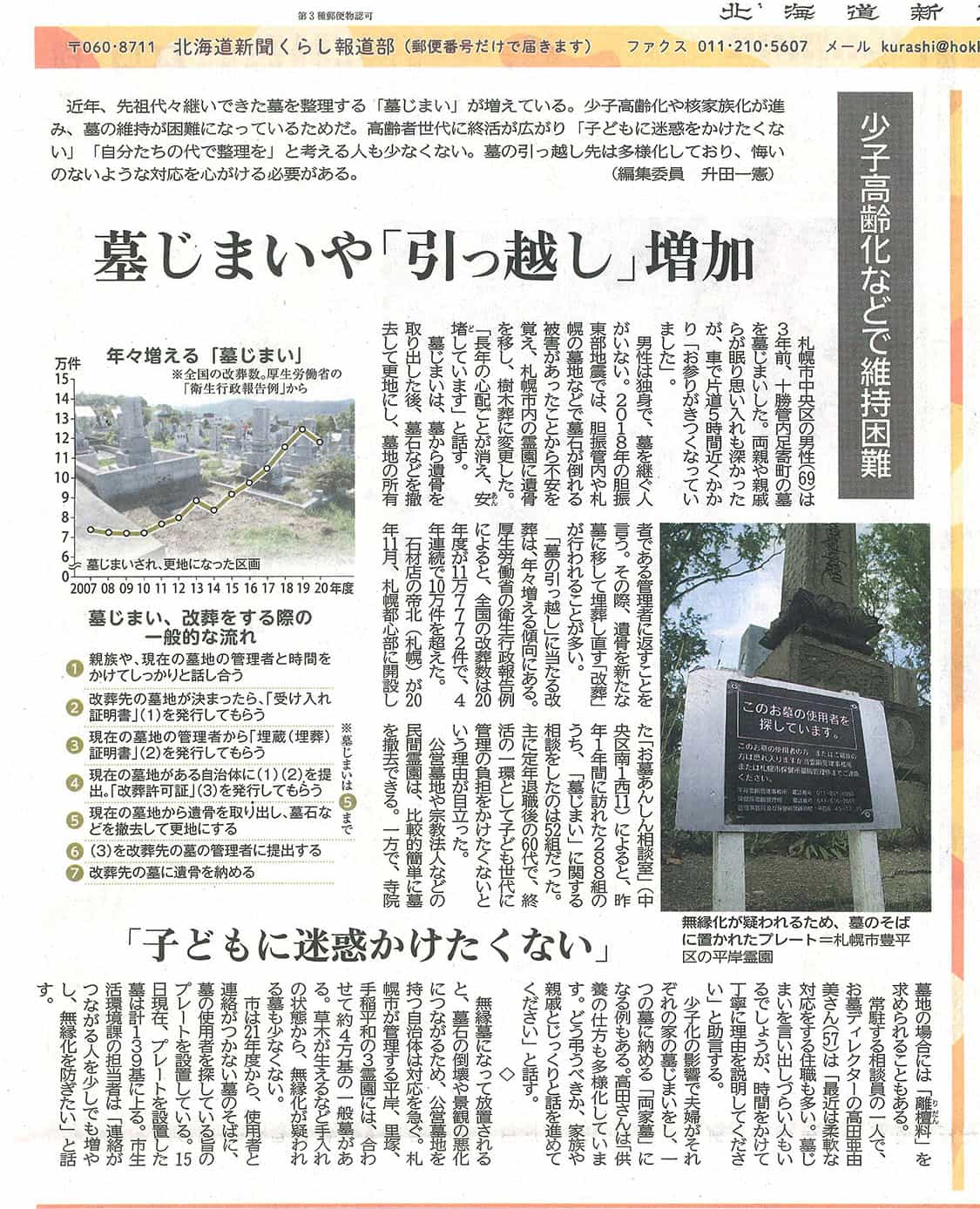 2022年9月20日 北海道新聞 近年、少子高齢化や核家族化が進んだことで増えている「墓じまい」について取材いただきました